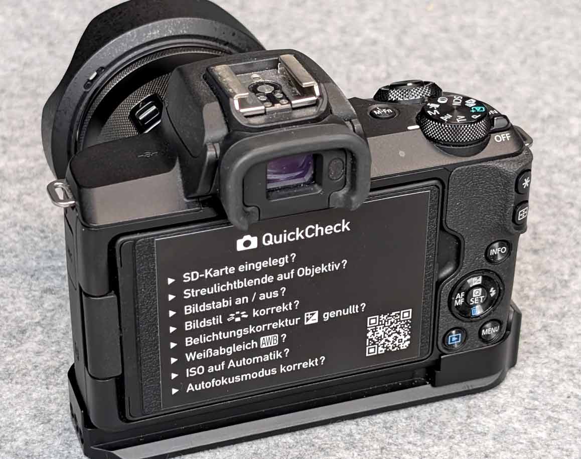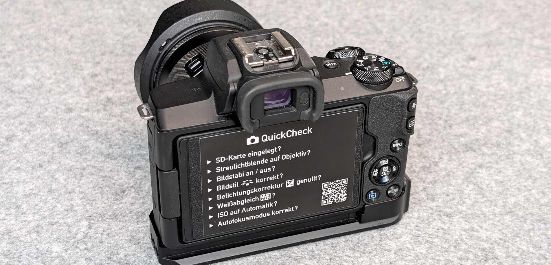 Hierzu haben wir eine kleine Checkliste zur Vermeidung der häufigsten (Flüchtigkeits)Fehler in puncto Kameraeinstellungen entwickelt und als Aufkleber drucken lassen. Diesen einfach auf die Rückseite des klapp-schwenkbaren Kameradisplays kleben und schon ist der „Preshoot-Check“ immer mit dabei!